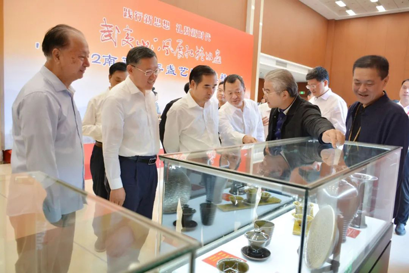 袁毅、葉雙瑜一行到活動現場,認真觀看建盞精品。他們充分肯定了青年藝術家的守正創新精神,希望各位青年藝術家貫徹落實好新發展理念,進一步傳承弘揚中國傳統文化,激發盞研隊伍創新活力,把文化優勢轉化為發展優勢,為全方位推進綠色高質量發展超越貢獻文藝力量。