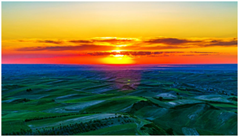 走進木壘,我最有感觸的是他的萬畝旱田,她綿延起伏,阡陌相連,猶如一幅美麗的山鄉美圖,滋潤萬物,蘊藏生機。她是國家農業公園,更是新疆農耕文化的發源地,起跑點,據考古史料記載,數千年前,遠古先民就在平頂山開荒造田,繁衍生息,開啟了平頂山早期的農業耕作。隨著歷史的發展,歷經農家世代耕耘,才造就了旱田今天層巒疊嶂、綠蔭如蓋、韻律無限的美景。種田一定要有水,神話傳說,這里是王母娘娘和七仙女的沐浴之地,所以才有如此豐裕的水資源,我認為是廣袤大天山,冰雪融化,涓涓細流匯聚成溪。我們從烏魯木齊驅車趕往木壘,看到遠處的天山山脈,山不高,離我們也很近,有幸進入天山腹地,才知道她的大,她的無比廣闊,她的讓人戰戰兢兢的峻峭、陡峭。望山跑死馬,大山就在眼前了,策馬揚鞭、馳騁飛跑,馬累死了山還是那么遠!新疆的耕地、立地條件絕好,可以用大型農業機械耕作,她的壯觀,我們閩北山區看不到的,所以隨便一個農戶都可以耕種幾十上百畝的耕地,這里的農民也很有意思,遇到干旱年份收成不好,小麥不會灌漿,他們也不會顆粒無收,大型農業機械開進麥田,收割好麥稈秸稈,賣給牧民,做牛羊的冬飼料,也是一份不小的收入。